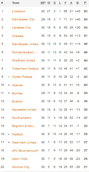 Jadwal, Hasil dan Klasemen Liga Inggris Pekan Ke-30, Senin (22/6/2020)