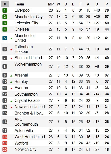 Berikut jadwal, hasil dan klasemen pekan ke-27 Premier League selengkapnya: