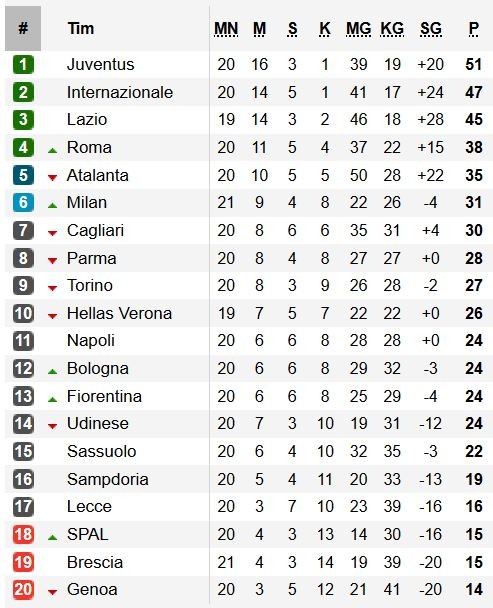 Saat ini, puncak klasemen masih dikuasai Juventus dengan poin 51, unggul empat angka dari Inter Milan di posisi kedua. Lazio coba menguntit di urutan ketiga dengan nilai 45, unggul dua angka dari AS Roma di posisi keempat.