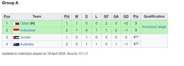 Poin Indonesia sama dengan Qatar yang berada di puncak klasemen. Qatar baru akan bermain malam ini melawan Yordania.