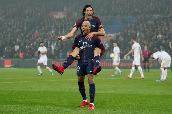 Mbappe dan Cavani merayakan salah satu gol di laga kontra Caen.