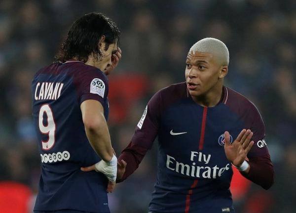 Mbappe berdiskusi dengan Cavani pada pertandingan kontra Caen.