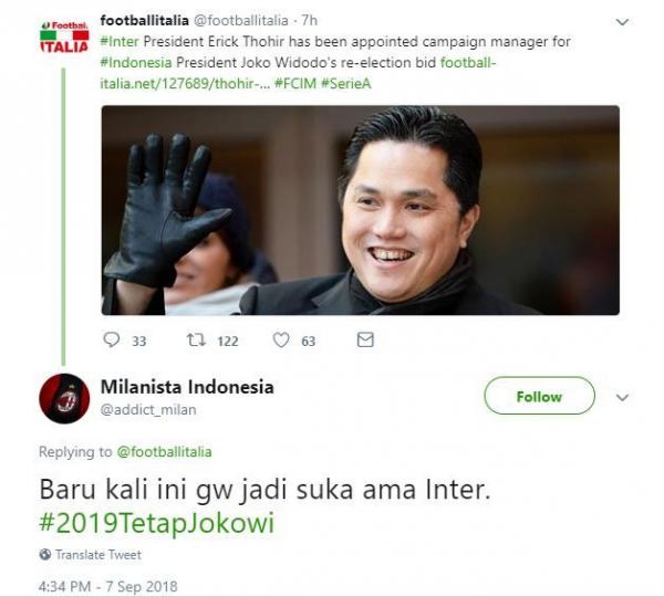 Salah satunya datang dari Milanista Indonesia @addict_milan. Uniknya, akun rival fans Inter itu mengaku menyukai Nerazzurri setelah ditunjuknya Erick sebagai Ketua KTN Jokowi-Ma'ruf.