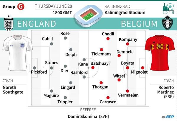 Ini akan menjadi pertemuan ketiga kedua tim di Piala Dunia, dengan Inggris tak pernah kalah dari lawannya itu. Mereka imbang 4-4 pada 1954, dan Inggris menang 1-0 pada putaran kedua Italia 1990 lewat gol tendangan voli David Platt. Total, Belgia hanya sekali menang dalam 21 pertemuan kontra Inggris (5 seri, 15 kalah).