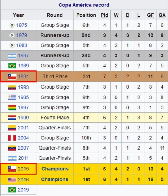 Chile merupakan tim yang rutin ikut serta pada Copa America sejak 1974. Mereka sudah empat kali menjadi finalis, dan dua kali menjadi kampiun pada edisi 2015 dan 2016