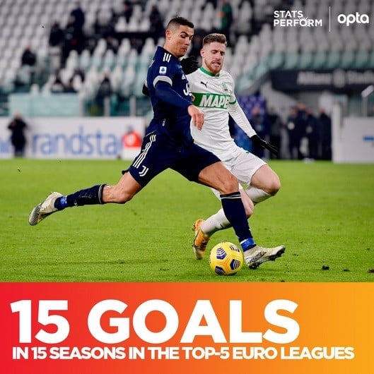 Menurut OptaPaolo, Ronaldo menjadi satu-satunya pemain yang bisa mencetak minimal 15 gol setiap musim dalam 15 tahun terakhir sejak 2006/2007.