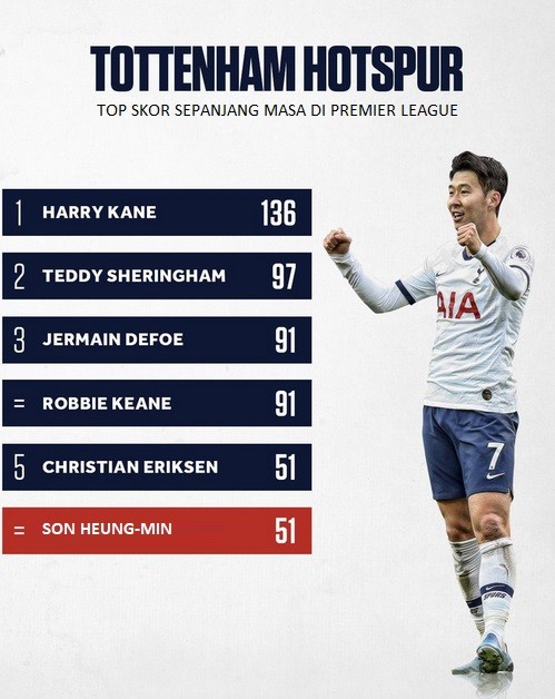Jika dijumlah dengan gol kedua, Son sejauh ini sudah mencetak 51 gol di Premier League. Dia menjadi pemain keenam sepanjang sejarah Tottenham yang bisa mencetak 50 gol atau lebih di liga setelah Harry Kane, Teddy Sheringham, Jermain Defoe, Robbie Keane dan Christian Eriksen.