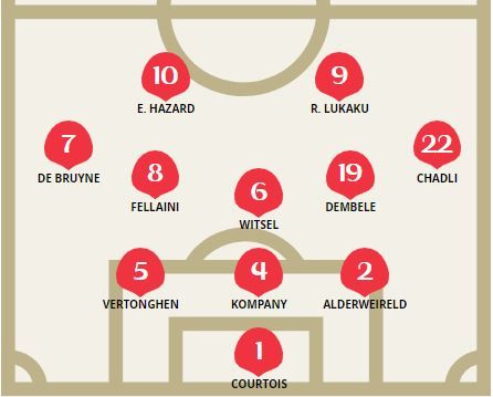 Untuk menopang keduanya, Marouane Fellaini, Kevin de Bruyne, Moussa Dembele, Axel Witsel serta Nacer Chadli akan mengisi lini tengah. Tiga bek, Toby Alderweireld, Vincent Kompany dan Jan Vertonghen akan menjadi benteng pertahanan, sebelum lawan bisa menembus Thibaut Courtois.