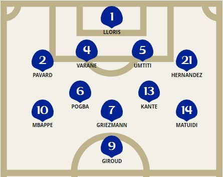 Sementara Pelatih Prancis Didier Deschamps masih mempercayakan formasi 4-2-3-1. Olivier Giroud ditempatkan sebagai ujung tombak seorang diri. Sedangkan Antoine Griezmann tetap memainkan peran sebagai kreator penyerangan. Deschamps mempertahankan posisi Kylian Mbappe, dengan menempatkan pemain Paris Saint-Germain (PSG) itu akan bermain dari sebelah kiri.