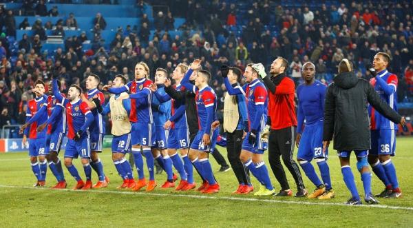 Para pemain FC Basel merayakan kemenangan mereka atas Manchester United.