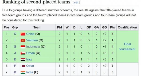 Sejauh ini Indonesia berada di posisi 3 klasemen runner up terbaik dengan 4 poin dan +1 selisih gol. Sedangkan dua pesaingnya Oman dan Irak hanya mengoleksi 3 poin.