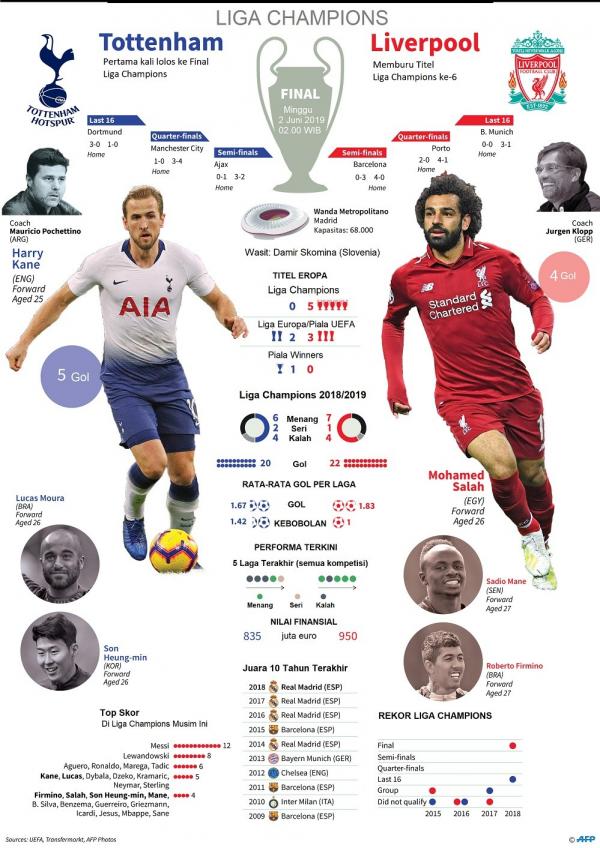 MADRID, iNews.id - Duel sengit bakal tersaji di Wanda Metropolitano saat Liverpool bertemu Tottenham Hotspur pada babak final Liga Champions, Minggu (2/6/2019) dini hari WIB. Laga yang akan disiarkan langsung RCTI mulai pukul 01.30, ternyata memiliki beberapa statistik menarik.