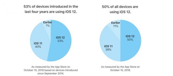Menurut data yang tersedia di laman pengembang Apple, yang dikutip dari BGR, sebanyak 53 persen dari semua perangkat iOS yang diperkenalkan selama empat tahun terakhir kini menjalankan iOS 12. Saat kumpulan data diperluas dengan menyertakan perangkat iOS yang dirilis sebelum 2014, tingkat adopsi tersebut tetapa berada pada 50 persen.