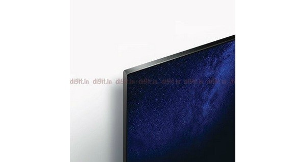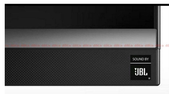 Terlihat jelas, TV telah mem-brush metal finish sudut kiri atas yang terbuat dari logam. Sedangkan di bagian kanan atas bawah terdapat branding 'Sound by JBL.'