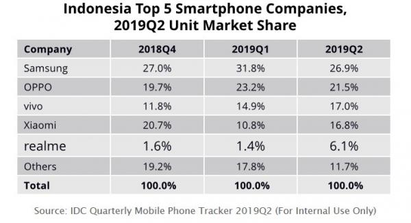 Tidak lama setelah Counterpoint meluncurkan laporan, Canalys juga melaporkan penjualan smartphone dan lima vendor smartphone dengan pangsa pasar terbesar di Indonesia selama kuartal kedua 2019. Canalys mengungkapkan Realme masuk dalam Top 5 Smartphone Brand di Indonesia dengan meraih 7 persen pangsa pasar Indonesia dalam waktu kurang dari setahun.