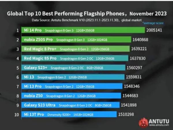Pada November 2023 terjadi perubahan besar pada posisi teratas dibandingkan Oktober, dengan tiga posisi teratas mengalami perubahan signifikan. Di mana kali ini Xiaomi 14 Pro dengan Qualcomm Snapdragon 8 Gen3, menduduki posisi puncak.