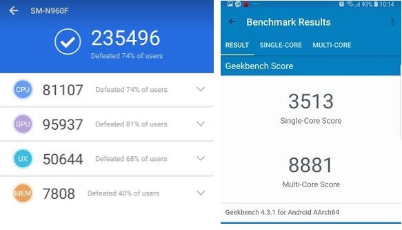 Selain menguji dari segi game, saya juga mengukur benchmark di AnTuTu dan Geekbench. Dari hasil AnTuTu, Note 9 berhasil mencetak skor 235496. Sedangkan Geekbench, suksesor Note 8 mencetak skor single-core 3513 dan multi-core 8881.