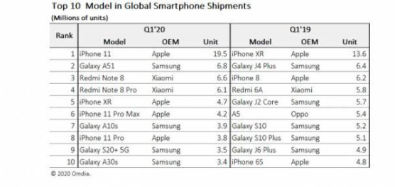 Samsung Galaxy A51 membuntuti iPhone 11 dengan penjualan sebanyak 6,8 juta unit alias jadi runner-up. Galaxy A10s dan Galaxy A30s adalah model terlaris ke-7 dan 10, masing-masing.