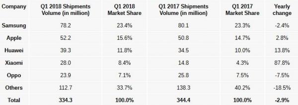 Pada Q1 2018, Samsung mengirim 2 juta perangkat lebih dan Apple meningkatkan jumlahnya sebanyak 1,4 juta. Huawei berhasil mengirim hampir 5 juta ponsel lebih dan sekarang menyumbang 11,8 persen dari pasar.