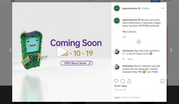“Sesuatu yang akan bawa kreativitasmy melampaui segala batas. Nantikan #OppoReno2Series,” kata Oppo lewat akun Instagramnya, Selasa (1/10/2019).