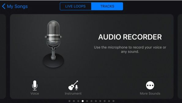 Kini, Anda bisa swipe ke samping untuk memilih instrumen bawaan, sound library, dan Audio Recorder. Untuk mengimport lagu yang sudah ada ke proyek baru, pilih Audio Recorder dengan mengetuknya. Layar Audio Recorder sudah diatur untuk merekam suara tapi jika ingin mengubah bagian musik yang ada menjadi ringtone, Anda tidak membutuhkan kontrol lebih. Sebagai gantinya, tap ikon ketiga dari kiri di atas layar. Pergi ke layar editing utama.