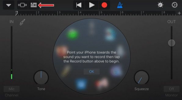 GarageBand bisa import trek musik tak terlindungi yang ada di iPhone. Aplikasi juga bisa melakukan ini untuk trek di tempat-tempat yang bisa diakses iPhone Anda seperti akun iCloud atau Dropbox. Untuk mengimport lagu, klik ikon loop di atas layar editing utama GarageBand.