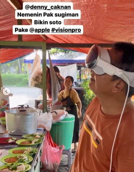 Dalam video terlihat, pedagang soto yang viral yang diketahui bernama Sugiman tampak dengan cekatan melayani pelanggan sambil mengenakan headset canggih Apple Vision Pro.