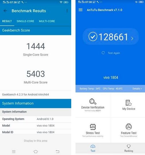 Selain experience, saya juga melakukan benchmark untuk V11 Pro menggunakan AnTuTu dan Geekbech. Hasil skor AnTuTu menunjukkan skor 128.661. Sedangkan di Geekbench, single core mencetak skor 1.444 dan multi-core 5.403.