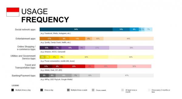 Selain aplikasi jejaring sosial, penelitian juga memaparkan frekuensi pengguna Indonesia menggunakan aplikasi entertainment. Sebanyak 17 persen beberapa kali membuka aplikasi entertainment seperti Spotify dalam sehari, Sembilan persen sekali sehari, 14 persen beberapa kali seminggu, enam persen sekali seminggu, 10 persen setidaknya sekali sebulan, dan 44 persen setiap setiap dua bulan atau kurang.