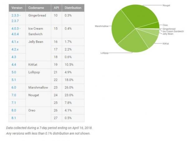 Dilihat dari statistik resmi Google, jumlah distribusi Android mengarah ke arah kanan- Oreo dan Nougat mengalami peningkatan pemasang, sementara setiap versi sistem operasi lainnya mengalami penurunan.