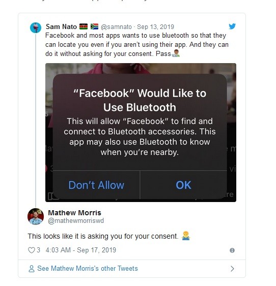 Lewat Twitter-nya @samnato membagikan sebuah tweet peringatan yang berbunyi, 'Facebook dan sebagian besar aplikasi ingin menggunakan Bluetooth sehingga mereka dapat menemukan Anda meskipun tidak menggunakan aplikasi mereka. Dan, mereka dapat melakukannya tanpa meminta persetujaun dari Anda."