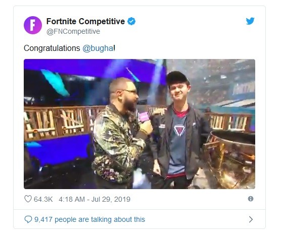 Fortnite World Cup Finals, yang berhadiah total 30 juta dolar AS atau Rp420 miliar berlangsung selama tiga hari yakni 26-28 Juli 2019. Pada hari terakhir turnamen, para pemain dari seluruh penjuru dunia bertanding dalam turnamen yang lebih kecil, dan Kyle 'Bugha' Giersdorf keluar menjadi pemainnya.