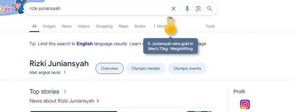 Pengguna Google bisa melihat animasi medali emas saat mengetikkan nama Rizki Juniansyah dan Veddriq Leonardo. Medali emas tampak terlihat dari bagian bawah ke atas.