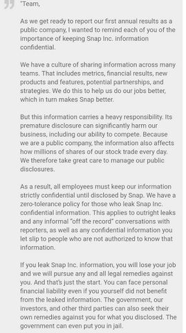 Di memo itu, ia juga menegaskan bahwa seseorang yang membocorkan informasi rahasia Snap dapat dikenai tuduhan kriminal, meskipun karyawan itu sendiri tidak memperoleh keuntungan dari data tersebut.