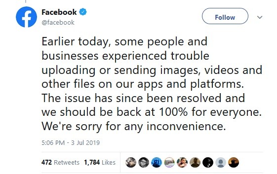 "Awal hari ini, beberapa orang dan bisnis mengalami masalah dalam mengunggah atau mengirim gambar, video, dan file lainnya di aplikasi kami. Masalahnya telah diselesaikan dan kami kembali 100 persen untuk semua orang. Kami mohon maaf atas ketidaknyamanan yang terjadi," bunyi tweet Facebook.