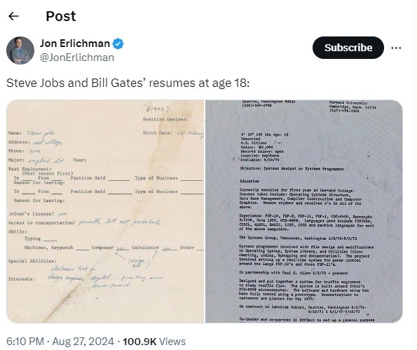 Viral Resume Steve Jobs dan Bill Gates saat Berusia 18 Tahun di Media Sosial, Warganet: Ini Sejarah