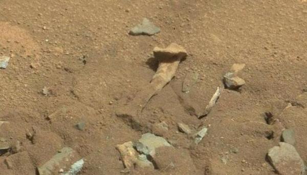 Curiosity NASA mengirim foto kembali ke Bumi pada 2014 yang menunjukkan batu yang sangat aneh berbentuk mirip tulang paha manusia. Para ilmuwan dengan terpaksa menjelaskan, bentuk tak biasa kemungkinan besar dihasilkan erosi oleh angin atau air.