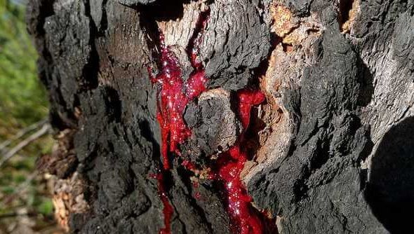 Bloodwood gurung terkadang melepaskan sepotong kulit yang membentuk luka. Dari kelupasan kulit itu, sebuah zat merah tebal keluar dari pohon.