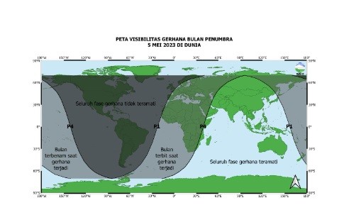 Berdasarkan peta visibilitas yang disajikan BMKG, Gerhana Bulan Penumbra 5 Mei 2023 dapat dilihat di sebagian besar Asia, Australia, sebagian kecil Afrika, dan sebagian Rusia.