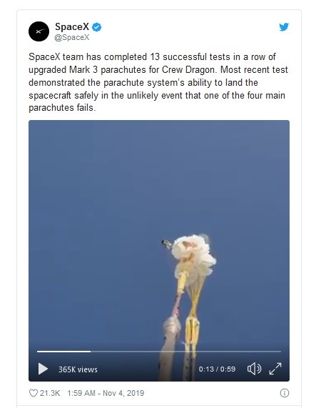"Tim SpaceX telah menyelesaikan 13 tes sukses dalam serangkaian parasut Mark 3 yang ditingkatkan untuk Crew Dragon. Sebagian besar pengujian baru-baru ini menunjukkan kemampuan sistem parasut mendaratkan pesawat luar angkas dengan aman jika salah satu dari empat parasut gagal," bunyi tweet SpaceX yang dikutip dari Cnet, Senin (4/11/2019).