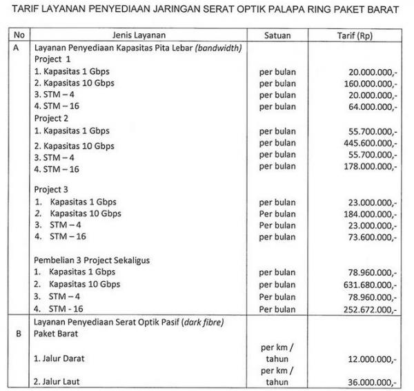 Dalam keterangan yang diterima iNews.id, Sabtu (28/9/2018), terdapat dua tarif penggunaan Palapa Ring Paket Barat. Pertama, tarif penyediaan kapasitas pita lebar atau bandwidth dan kedua tarif penyediaan kabel serta optik pasif atau dark fibre.