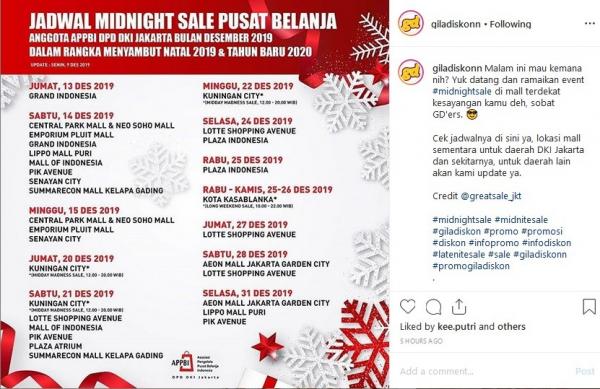 "Malam ini mau ke mana nih? Yuk datang dan ramaikan event #midnightsale di mall terdekat kesayangan kamu deh, sobat GD'ers. Cek jadwalnya di sini ya, lokasi mall sementara untuk daerah DKI Jakarta dan sekitarnya, untuk daerah lain akan kami update ya. Credit @greatsale_jkt," tulis Instagram @giladiskonn, dikutip Sabtu (14/12/2019).