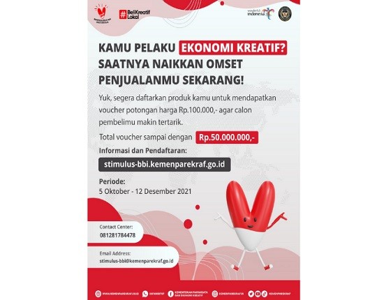 Ayo jadi pejuang negeri dengan Bangga Buatan Indonesia dan beli kreatif lokal. Kapan lagi mendapatkan produk lokal berkualitas dengan subsidi harga sangat menarik, tentunya hanya di Program Stimulus Bangga Buatan Indonesia.
