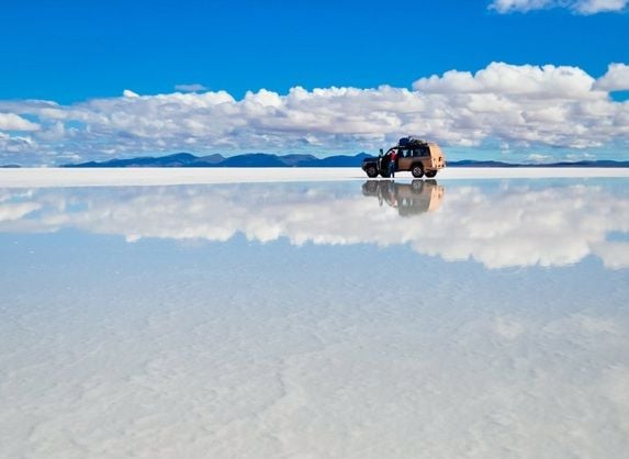 Dijuluki sebagai The world's largest salt flat, Salar de Uyuni dapat ditemukan di Bolivia. Tempat ini terletak di pegunungan Andes. Dibentuk ketika danau garam prasejarah kering dan membentuk dataran sejauh 4.086 mil persegi. Tempat ini ditutupi dengan garam putih pucat dan lapisan tipis air selama musim hujan. Lapisan ini menyebabkan efek cermin yang sempurna di atas permukaan datar, mendorong banyak orang untuk menyebutnya sebagai cermin terbesar di dunia.