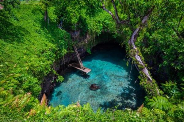 Letusan gunung berapi di pulau Upolu di Samoa menciptakan gua aquamarine yang menakjubkan. Sua Ocean Trench yang memiliki arti "lubang besar" ini merupakan hasil dari letusan gunung berapi tersebut. Kolam renang alami yang dikelilingi dinding batuan yang tinggi menjulang ini harus Anda kunjungi. Tempat ini menyuguhan panorama indah, dikelilingi batuan yang dipenuhi dengan tumbuhan hijau, ikan tropis, dan dataran berpasir. Selain itu, deretan kanal yang menjadi mata air dari Samudera Pasifik yang menuju ke kolam ini membuat Sua Ocean Trench tidak akan pernah kering.