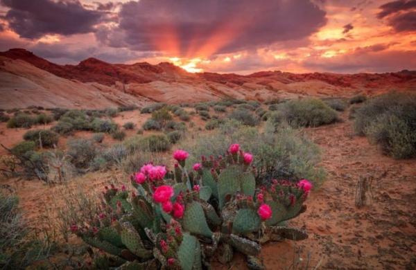 Matahari terbenam musim semi yang menakjubkan di gurun Nevada dengan pemandangan bunga kaktus. Bunga kaktus membantu matahari terbenam pada musim semi ini. Mereka terlihat bersinar di gurun Nevada.