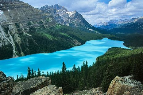 Danau di Taman Nasional Banff terlihat sangat biru dengan dikelilingi perbukitan yang hijau. Danau Peyto sangat indah dilihat dari Bow Summit, yaitu dekat Danau Louise Alberta yang merupakan tempat sebagian besar foto dari danau berwarna diambil. Para pengunjung yang pemberani juga dapat mendaki ke danau dan gletser. Jika lelah, Anda dapat beristirahat di Banff Hot Springs. Anda dapat meregangkan otot-otot Anda di mata air panas alami.