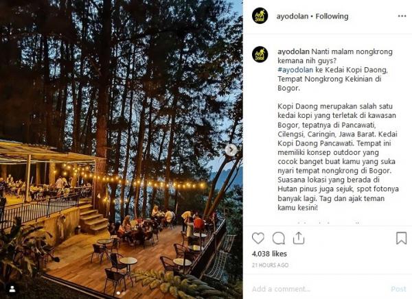 Kopi Daong merupakan salah satu kedai kopi yang terletak di kawasan Bogor, tepatnya di Pancawati, Cilengsi, Caringin, Jawa Barat. Kedai Kopi Daong Pancawati. Tempat ini memiliki konsep outdoor yang cocok untuk Anda yang suka mencari tempat nongkrong di Bogor. Suasana lokasi yang berada di Hutan pinus juga sejuk, spot fotonya banyak.