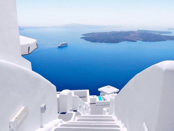 Sebuah kapal pesiar berlayar di Laut Mediterania, di lepas pantai Santorini, Yunani.