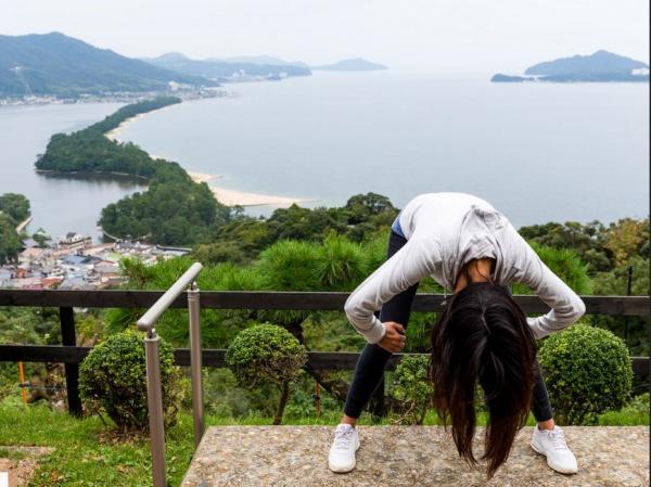 Amanohashidate berarti "bridge to heaven" dalam bahasa Jepang. Jembatan ini memiliki landmark Kyoto yang menarik dari sudut pandang berbeda. Gundukan pasir, yang membentang sejauh dua mil ke Teluk Miyazu, paling menarik dipandang terbalik. Jika melihatnya secara terbalik, Anda akan melihat jembatan itu sebagai naga yang akan terbang ke surga. Menurut legenda, ini akan membawa keberuntungan bagi Anda jika melihatnya seperti ini.